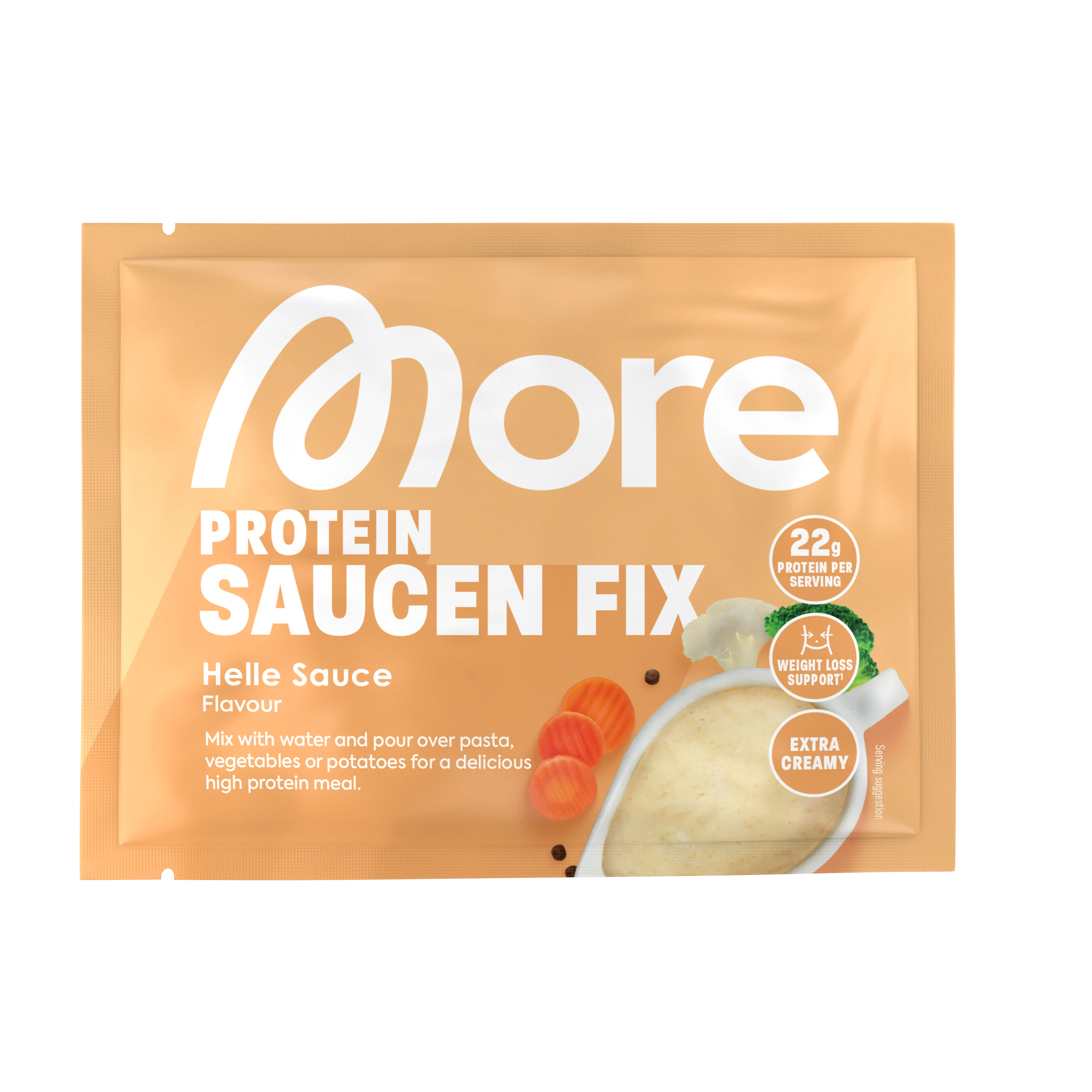 The day was long, hunger was great, but you don’t feel like a complicated cooking session? Understandable! Ready-to-mix sauces are the quick solution – but most contain hardly any nutrients, lots of added sugar, and often the taste is underwhelming. There’s room for More! That’s why our product developers have tinkered, mixed, and optimised. Et voilà – the More Protein Sauce Mix is here: Whipped up in seconds into an incomparably creamy sauce, with up to 22 g of protein per serving from field bean protein, whey protein concentrate, and calcium caseinate, plus valuable fibres – this is the perfect sauce for your favourite dishes.² By the way: depending on the variety, our mix contains up to 6 times more protein and up to 5 times more fibre compared to conventional instant sauces. Perfect for making it easier to meet your daily protein requirements. Good to know: We recommend consuming about 2 g of protein per kg of body weight daily to ideally nourish your body. Proteins are, for example, the ideal support for muscle building and maintenance, especially during phases when you reduce calories and want to prevent muscle loss.⁴ So quick, delicious, and protein-rich – this is exactly the sauce you need for a hectic daily routine. But watch out, because our mix can do even more.